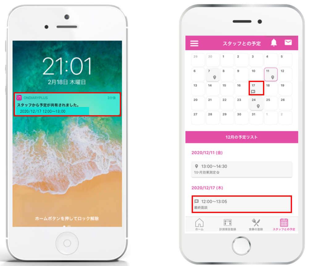 また、会員のON DIARYアプリに予定が共有されたことが通知され、スタッフとの予定画面のカレンダーと予定リストに予定が追加される