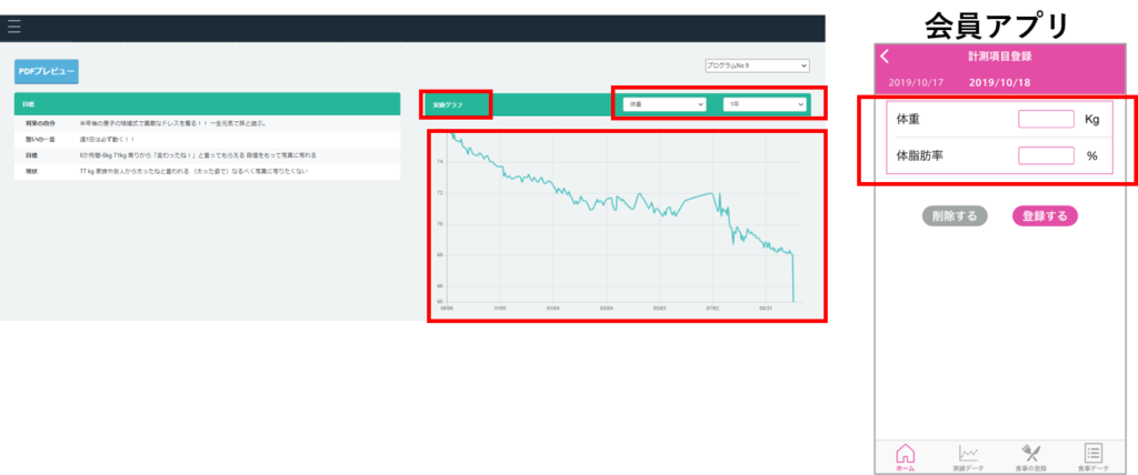 会員がアプリの〈計測項目登録〉で入力した体重などの記録は、〈会員カルテホーム〉ページの〈実績グラフ〉で確認できます。