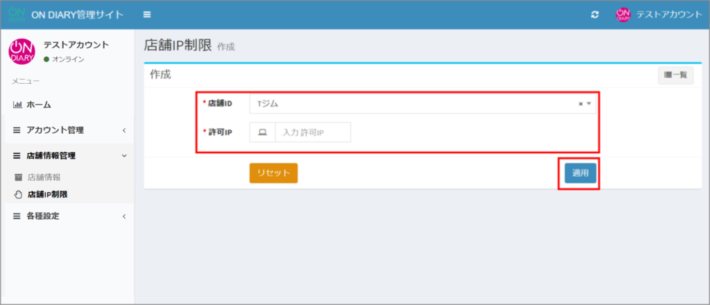 ④店舗IP制限作成画面で、店舗を選択し、使用を許可するIPアドレスを入力し、〈適用〉を押す