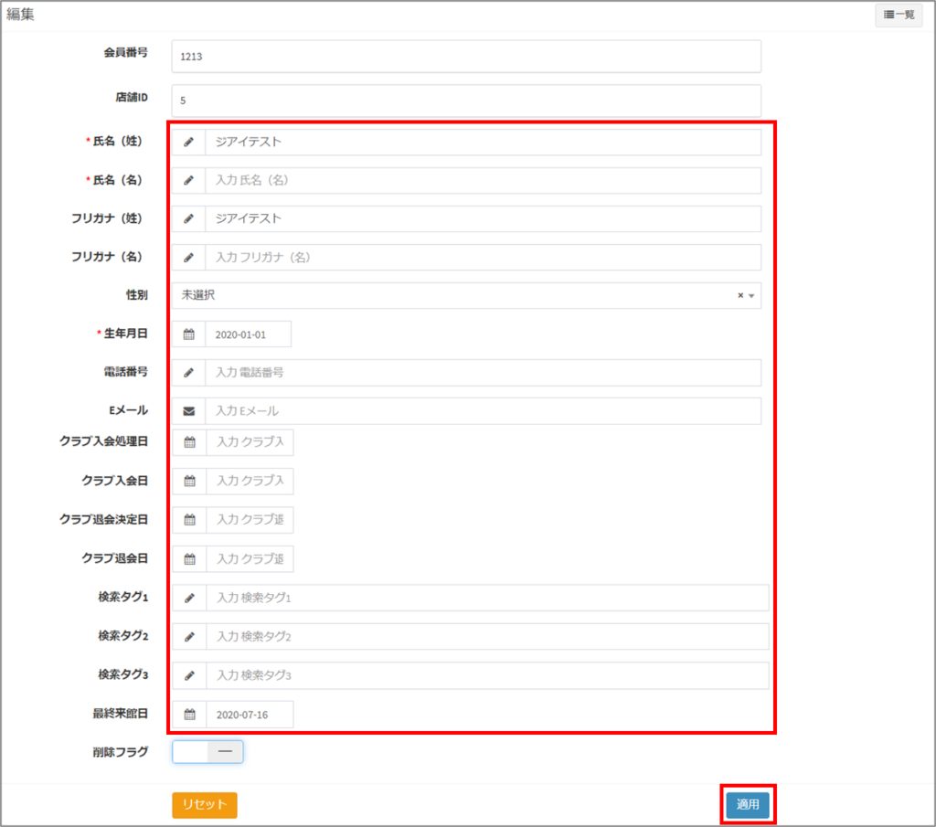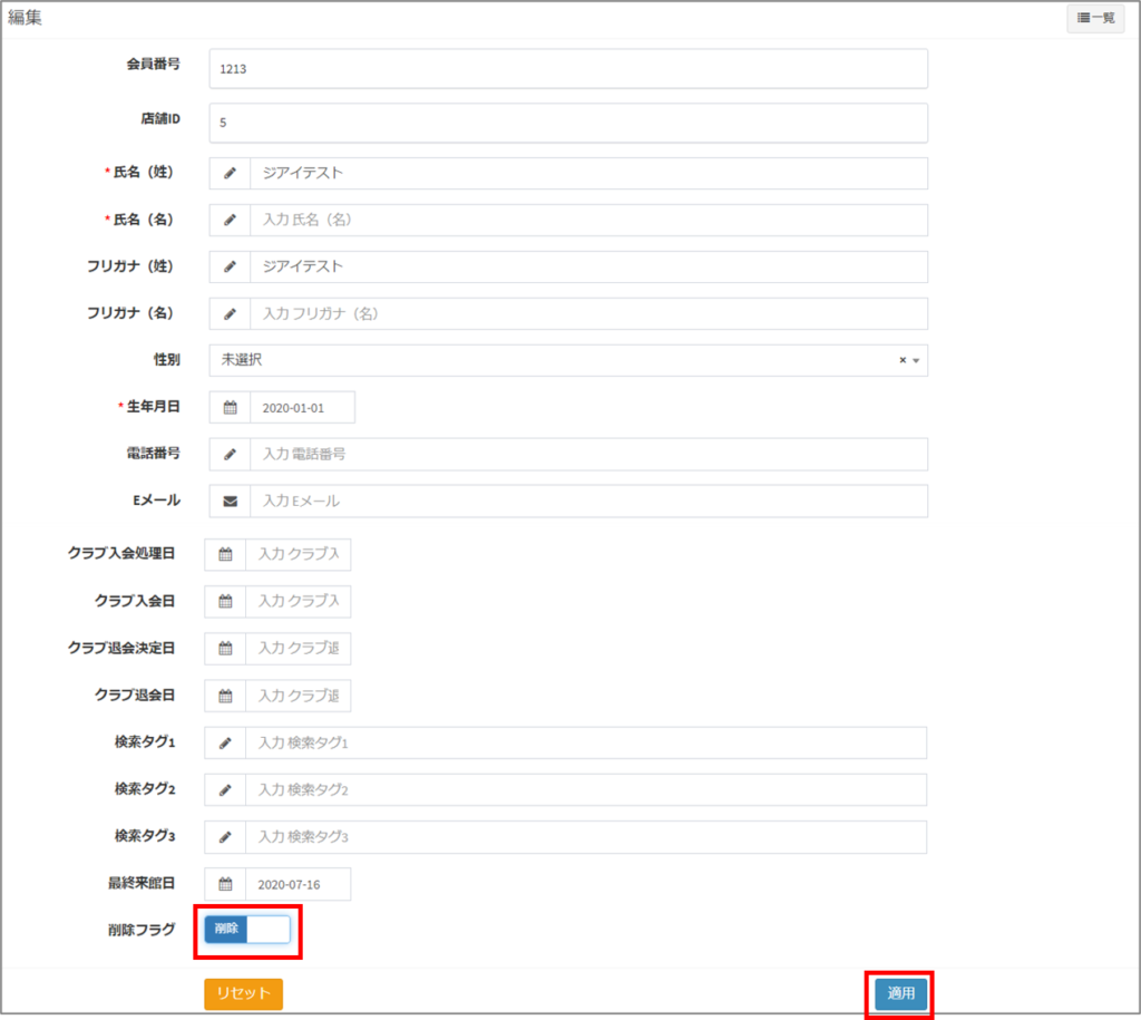 ⑤削除する場合、編集画面で〈削除フラグ〉を「削除」に切り替え、〈適用〉を押す