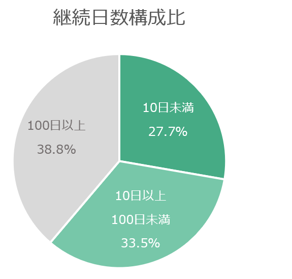 習慣化するまでにかかる日数として一般的に「3週間」「3ヶ月」があると言われていますが、なんとなくここに一つポイントがあるのかなと思い、今回100日未満で行動目標チェックを辞めてしまった会員様を対象に、どのくらい続いたかを検証してみました。