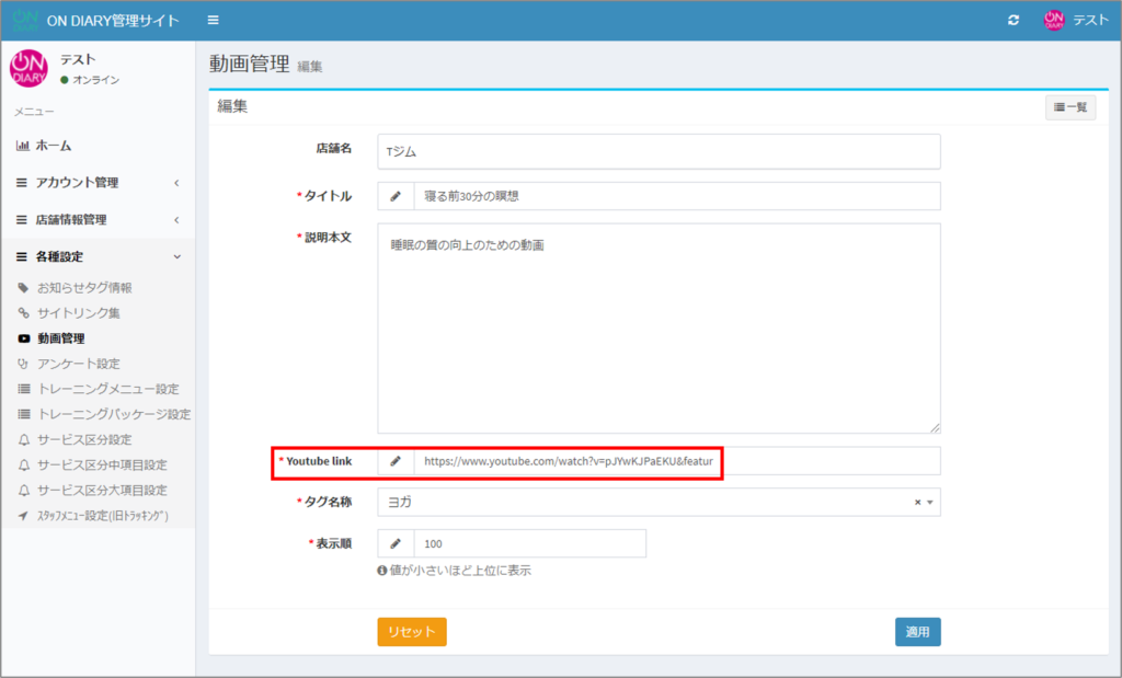 ON DIARY管理サイトの【登録情報管理】の【各種設定】の【動画管理】で、再生できない動画の編集画面にて、「Youtube link」(リンク先のURL)を確認してください。
