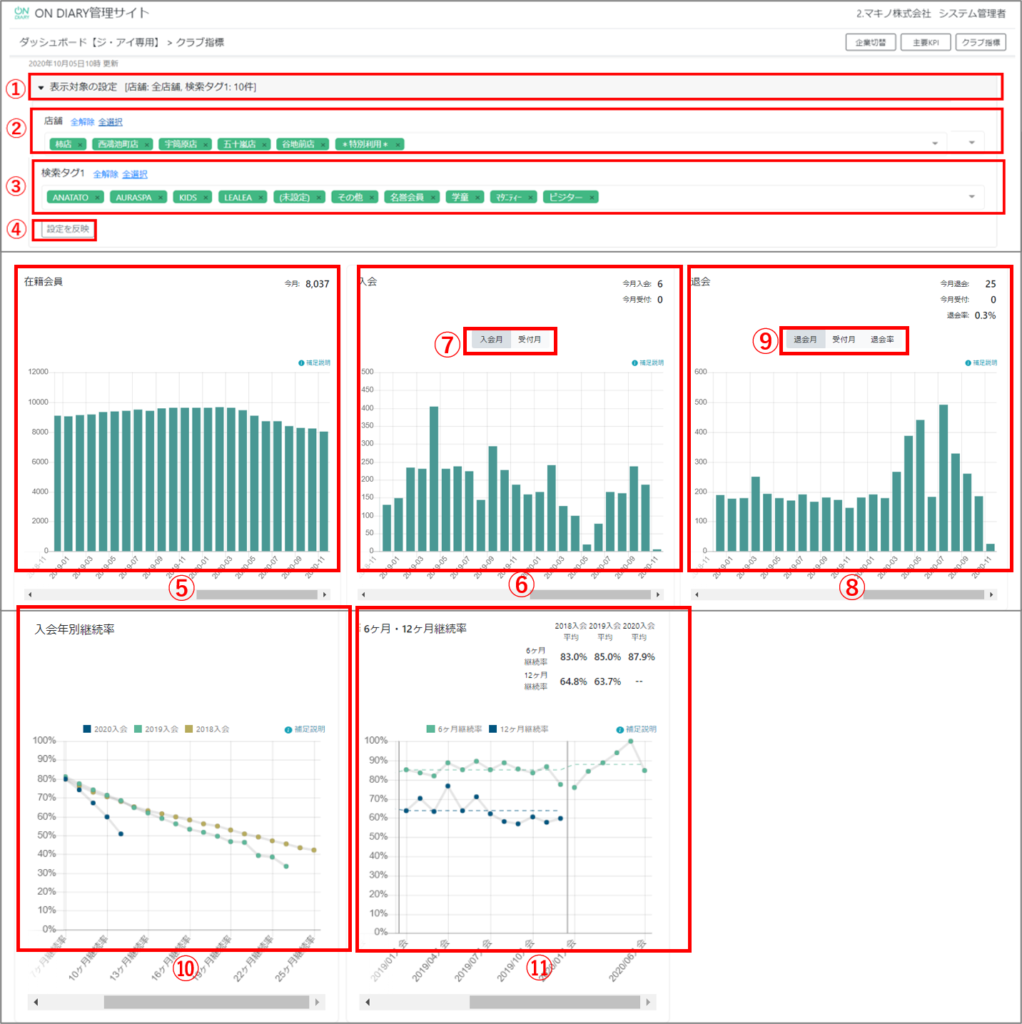 ON DIARY管理サイトにて、クラブの運営上重要なKPIを確認することができます。