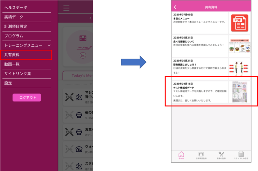 測定結果データやトレーニング資料などを会員アプリへ共有することができます。