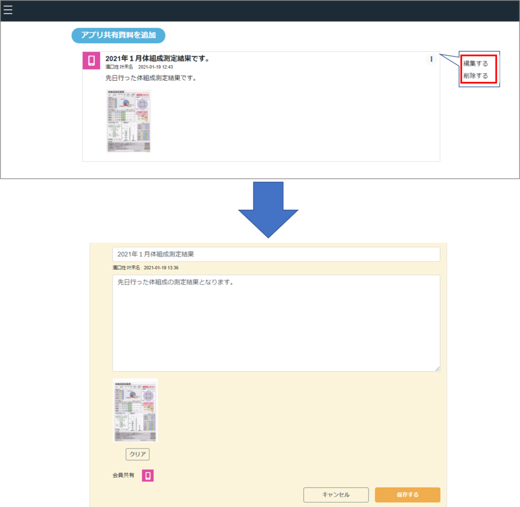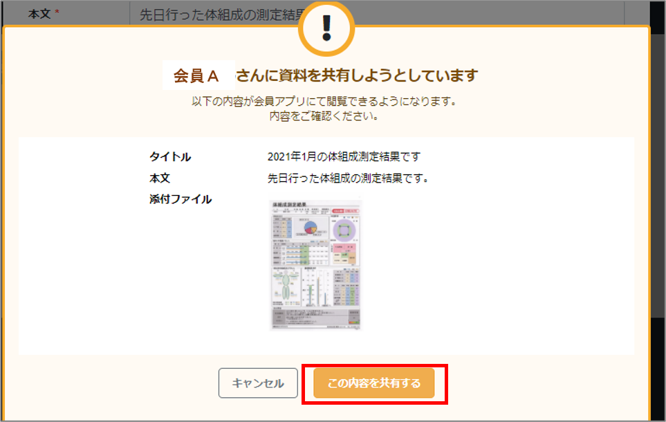 ④確認メッセージが出力されるので<この内容を共有する>を押すと会員アプリに共有される