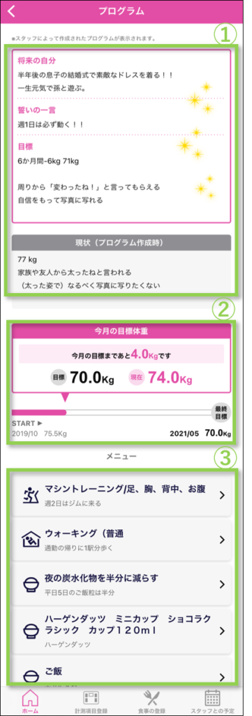 ①スタッフサイトの<会員カルテ>の<プログラム>で作成した『将来の自分』『誓いの一言』『目標』『現状』が表示されます。