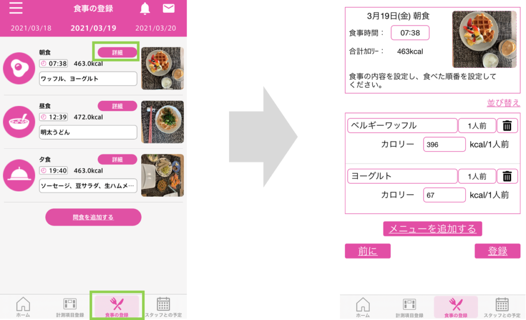 A.食事を追加・編集・削除をするにはホーム画面一番下の【食事の登録】から【詳細】を押すと食事内容の編集や削除ができます。