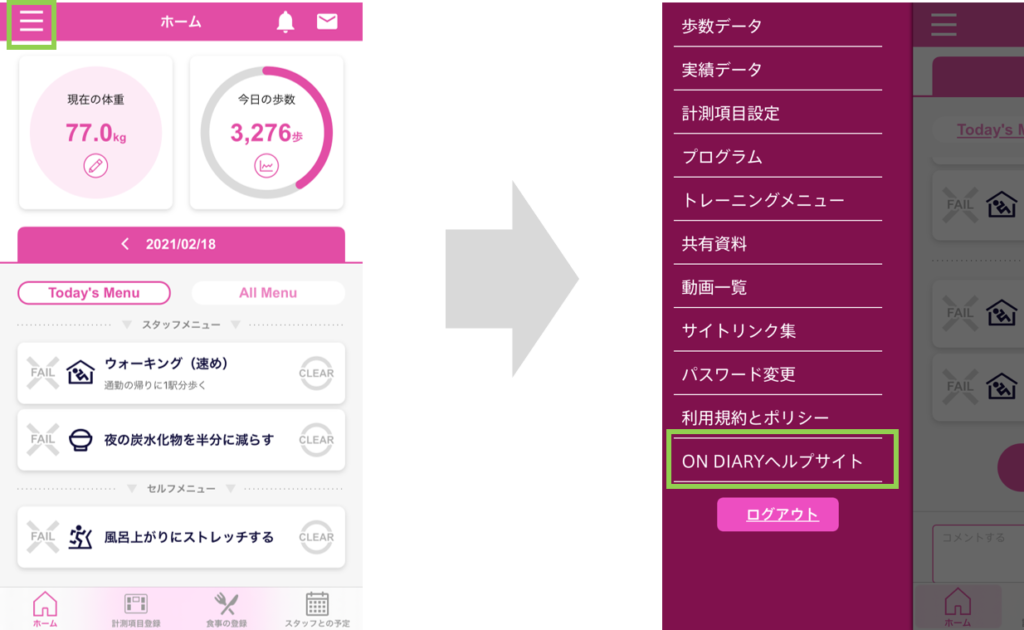 A.サイドメニューにあるON DIARYヘルプサイトをご確認ください。