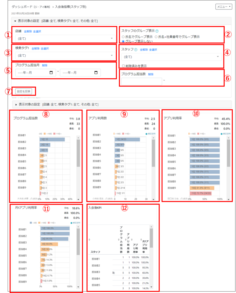 スタッフ毎の⑧~⑪の指標を全スタッフ分まとめて一覧で表示