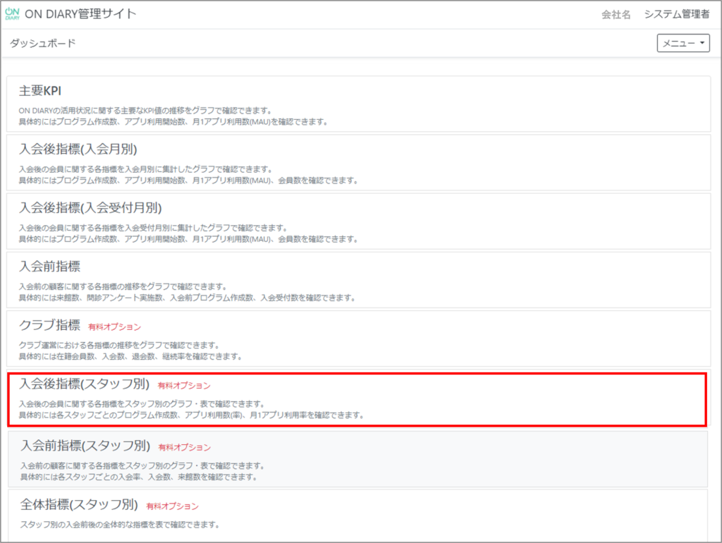 ON DIARY管理サイトの各スタッフ毎に、会員入会後の指標となる「プログラム作成数」「アプリ利用数(率)」「月1アプリ利用率」「入会後KPI」を確認できます。