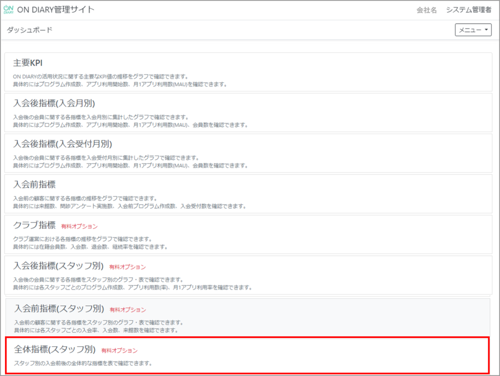 ON DIARY管理サイトの各スタッフ毎に、入会前後の全体的な指標を確認できます。