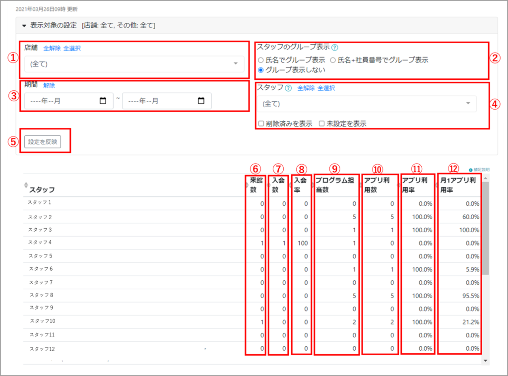 ⑥~⑫の指標について、スタッフ氏名の昇順で全スタッフ分一覧で表示
