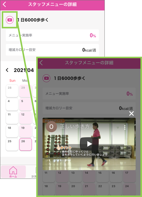トレーニングメニューや毎日の習慣メニューにも動画の設定ができます。