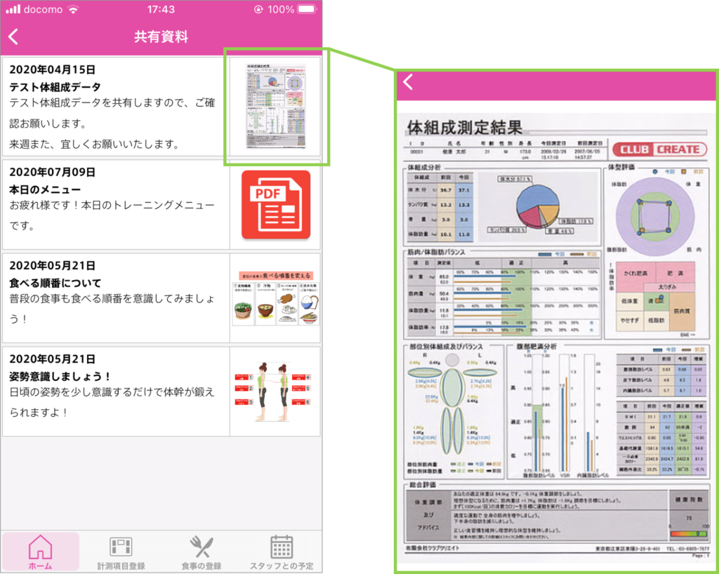 会員に紙で渡している資料はありませんか?例えば、体組成結果やトレーニングの際に使用した紙の資料などです。スタッフが画像やPDFを登録することで会員はいつでもアプリから確認ができます。過去の資料との比較などが手軽に行えます。