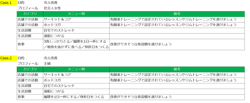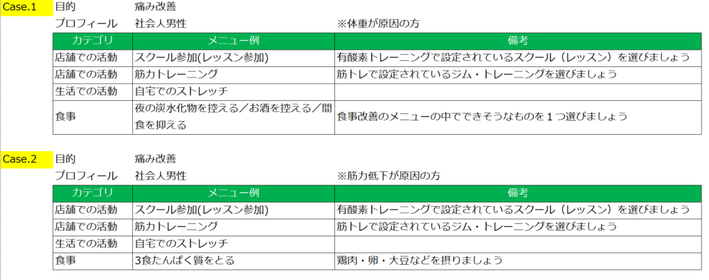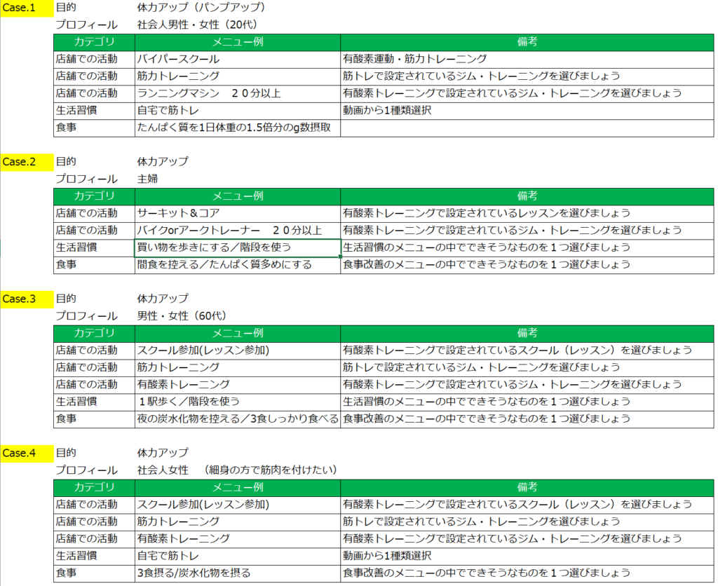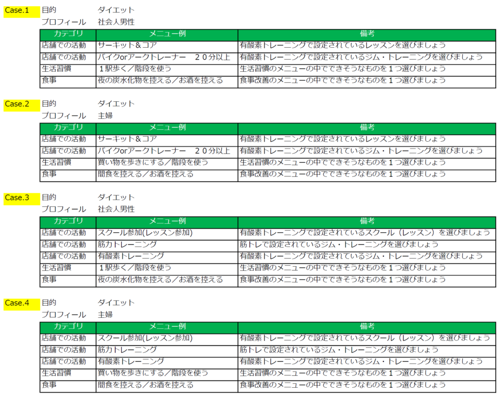 プログラム作成画面における行動目標(スタッフメニュー)(店舗での活動・生活での活動<生活習慣>・食事改善)の目的別、顧客属性別の作成事例集を掲載いたします。行動目標(スタッフメニュー)を作成する際の参考にしてください。