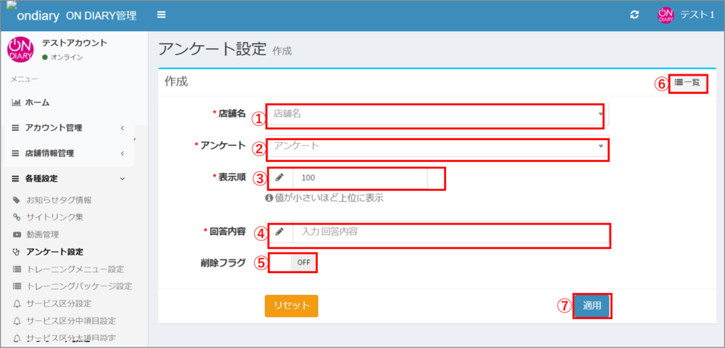 ⑥編集する場合、必要事項を編集し〈適用〉を押す。削除する場合、削除フラグを「ON」にして〈適用〉を押す。