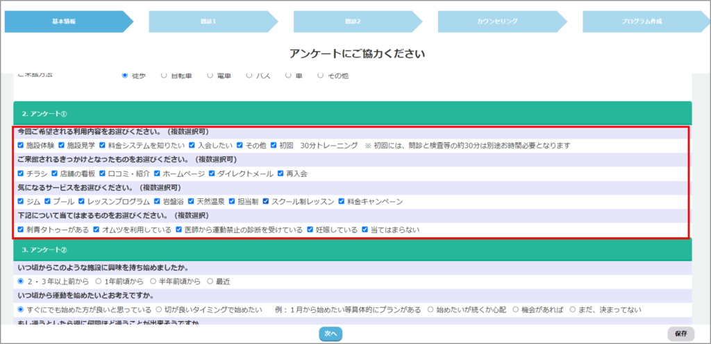追加されたアンケートの回答は、スタッフサイトで行うカウンセリング時に使用するアンケート①の回答の選択肢となります。