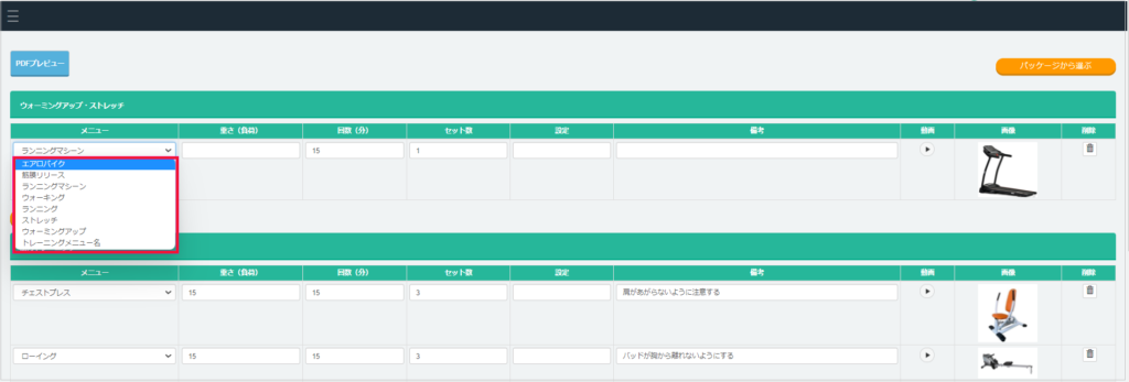 作成したトレーニングメニューは、スタッフサイトで会員毎のトレーニングメニューを作成する時に選択肢として表示されるメニューとなります。