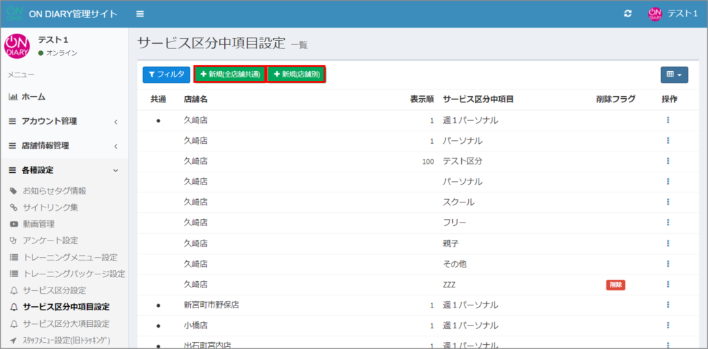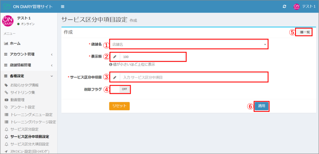 ON DIARY管理サイトで、サービス区分中項目を追加する方法です。