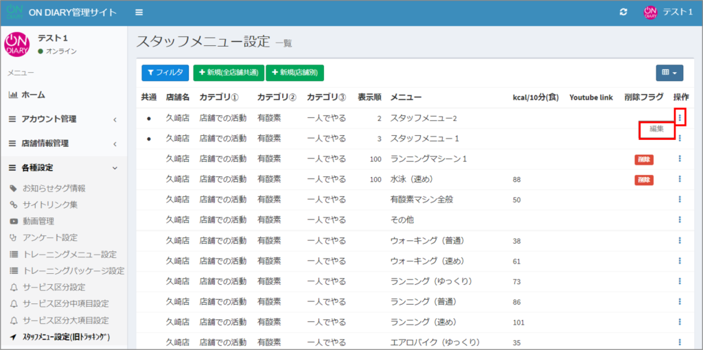 ⑤登録されているメニューを編集や削除する場合、一番右〈操作〉の下の点をクリックし〈編集〉を押す