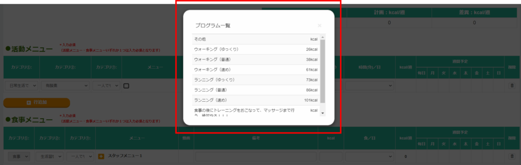 登録したスタッフメニューは、会員毎のプログラム作成時に、活動メニューや食事メニューの選択肢として表示されます。