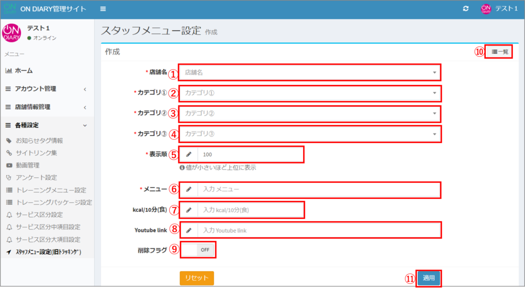 ⑨「削除フラグ」を「ON」にすると、一覧表で「削除フラグ」が「削除」となり、スタッフメニューの選択肢として表示されなくなります。
