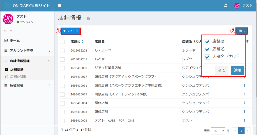 ②右上のボタンを押して、一覧で表示する項目を「店舗ID」「店舗名」「店舗名(カナ)」から選べます。