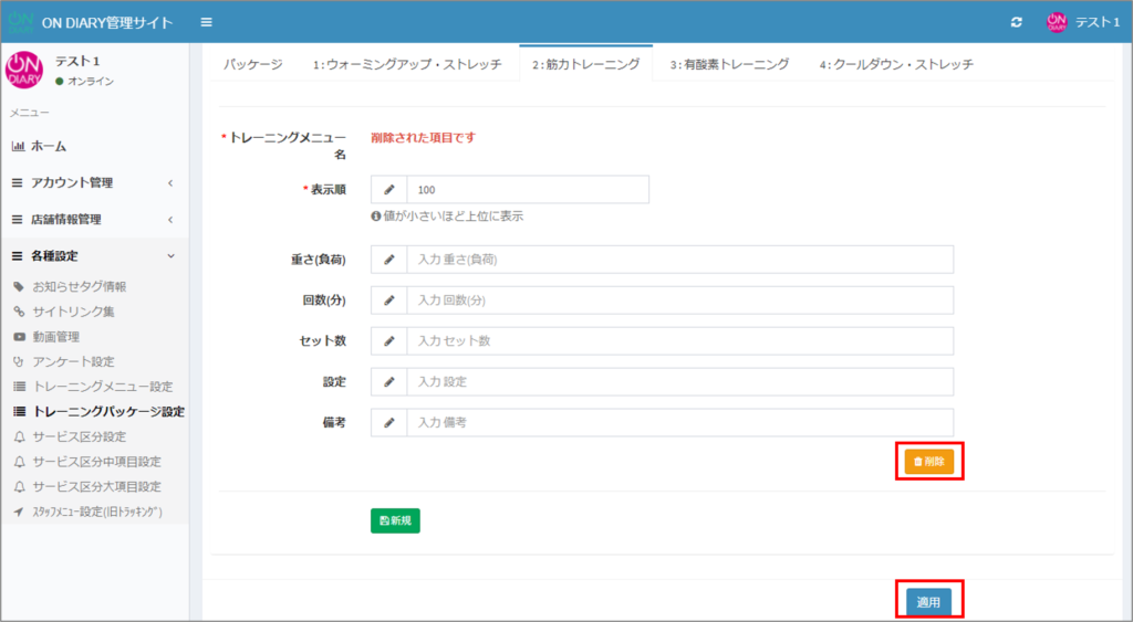 削除済のトレーニングメニューを、上記の2つの画面からも削除したい場合は、ON DIARY管理サイトのトレーニングパッケージ設定で、「削除された項目です」と表示されたトレーニングメニューの編集画面にて、〈削除〉を押し〈適用〉を押します。