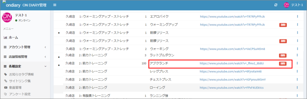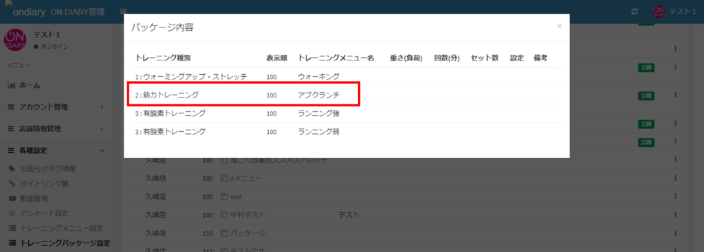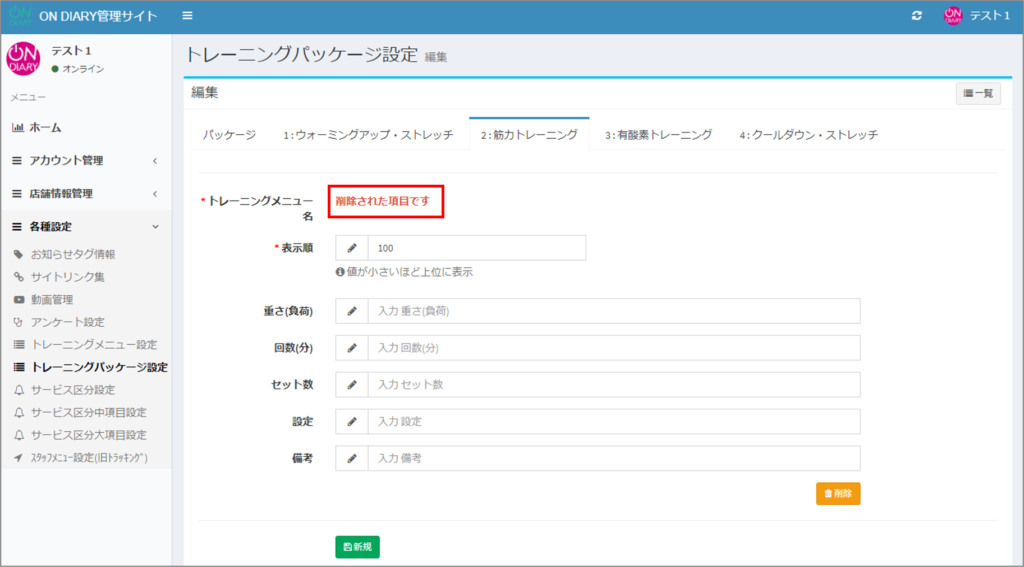 【ON DIARY 管理サイト トレーニングメニュー設定画面】