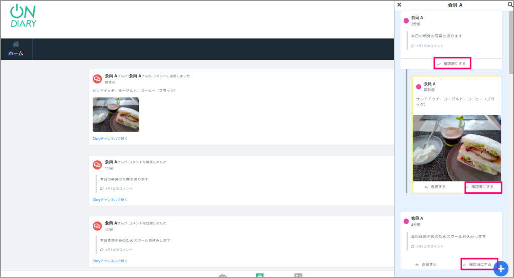 Diaryチャンネルを開き、未確認のコメント毎に【確認済にする】を押す