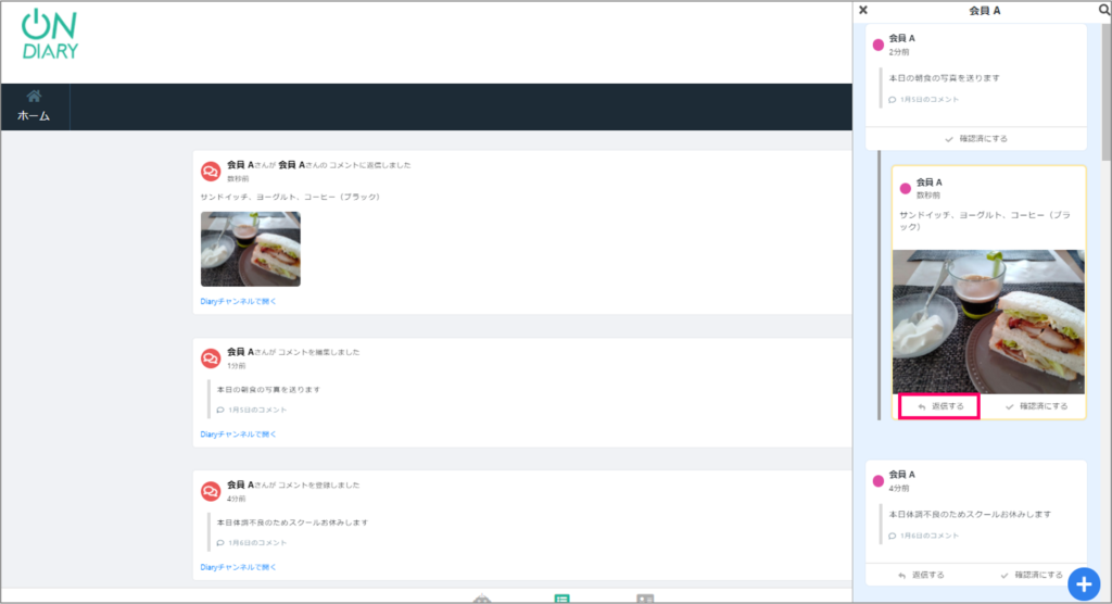 Diaryチャンネルを開き、未確認のコメントがあるスレッドで、 【返信する】を押し、コメントやスタンプで返信すると、そのスレッド内の未確認コメントは全て「確認済」となります。