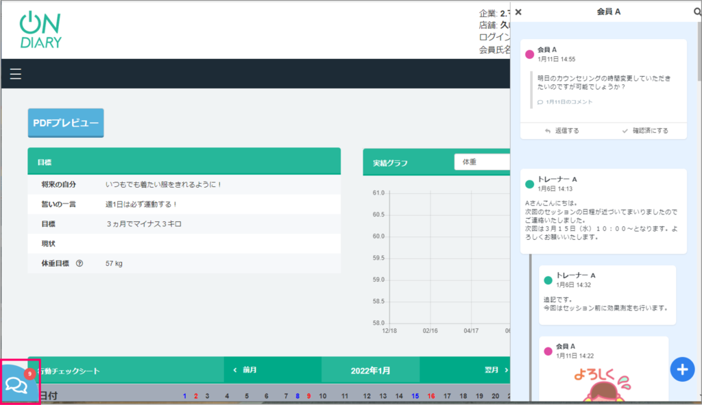 新着コメント(未確認のコメント)があると、会員カルテホームの左下の 【Diaryチャンネルのアイコン】 に、新着コメント数が表示されます。 【Diaryチャンネルのアイコン】を押すと、Diaryチャンネルが画面右側に表示されます。