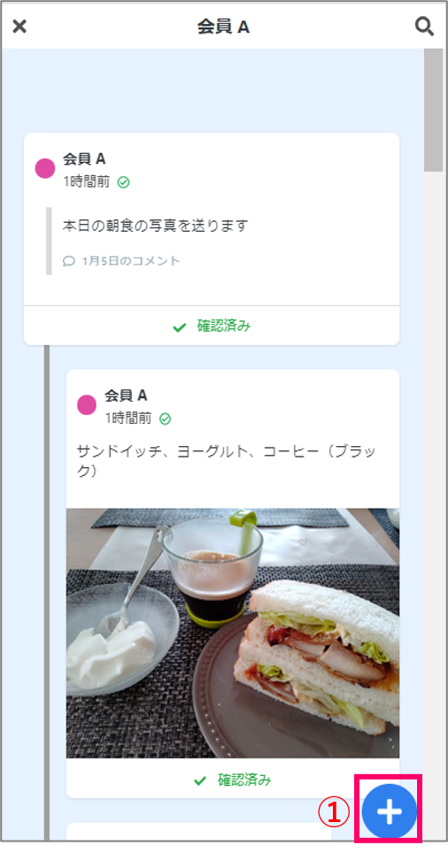 該当会員のカルテホームを開き【Diaryチャンネルのアイコン】を押すと、Diaryチャンネルが表示されます。