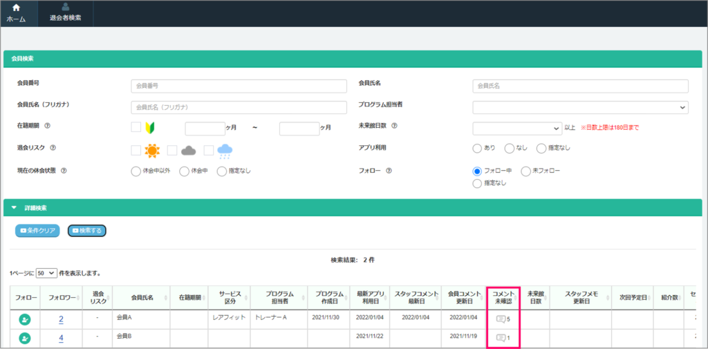 会員検索を「フォロー中」等の条件で絞り、検索結果の「コメント未確認」欄で確認できます。