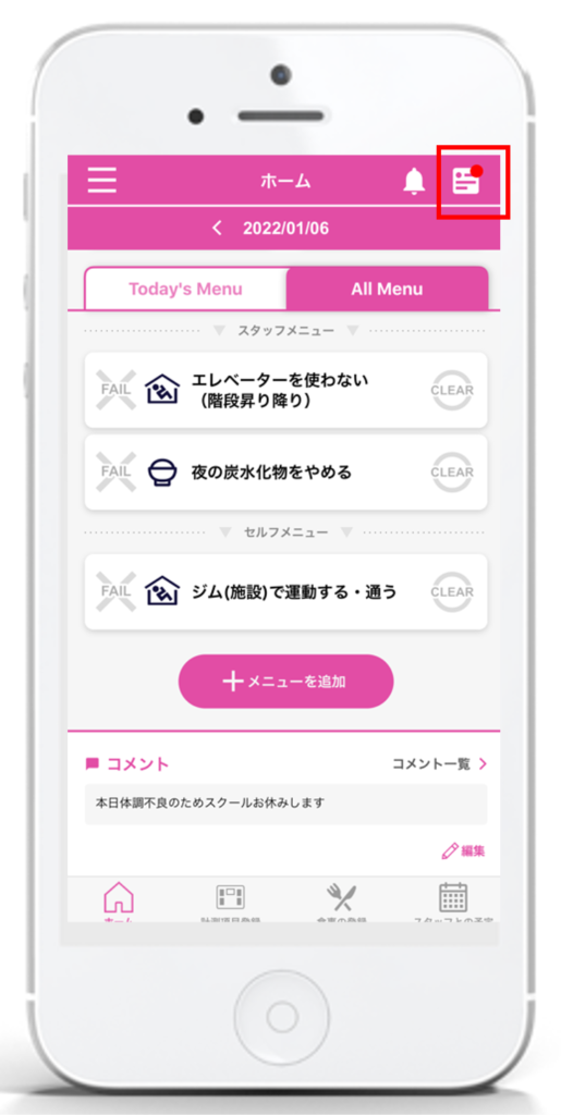 スタッフサイト側のDiaryチャンネルからコメントを送ると、会員アプリにプッシュ通知が表示され、ON DIARYアプリのホーム画面右上の【Diaryチャンネルボタン】にバッチ(赤い丸)がつきます。