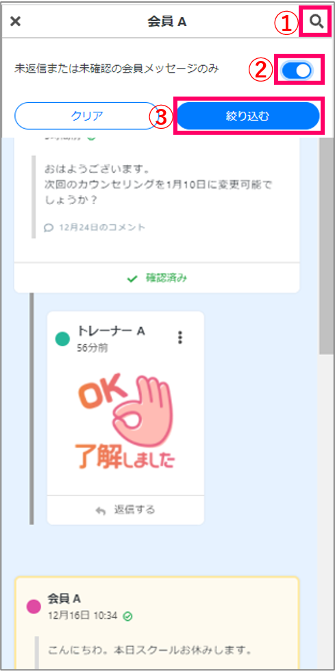 ②「未送信または未確認の会員メッセージのみ」を【ON】にする