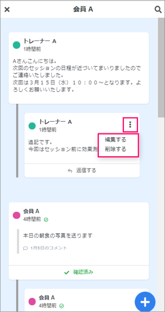 スレッド内の最新のコメント(スタンプ・画像)の右上のボタンを押し、【編集する】【削除する】を選ぶと、送ったコメントの編集・削除ができます。