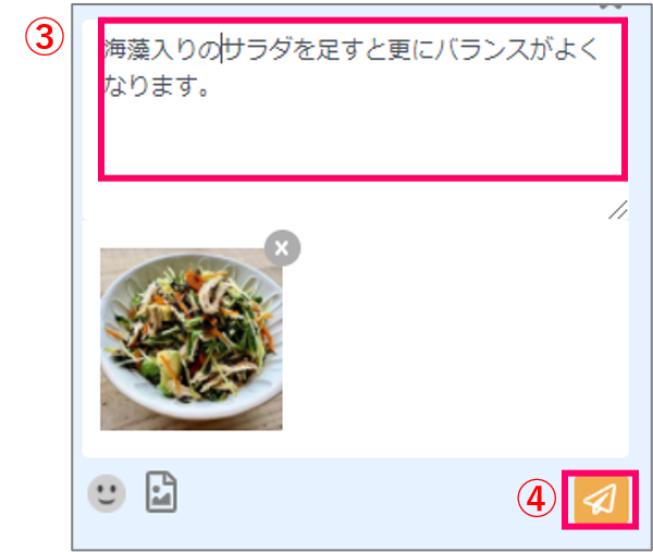 ③エクスプローラーが表示されるので送る画像を選ぶと、③の画面が表示されるので文章を入力する