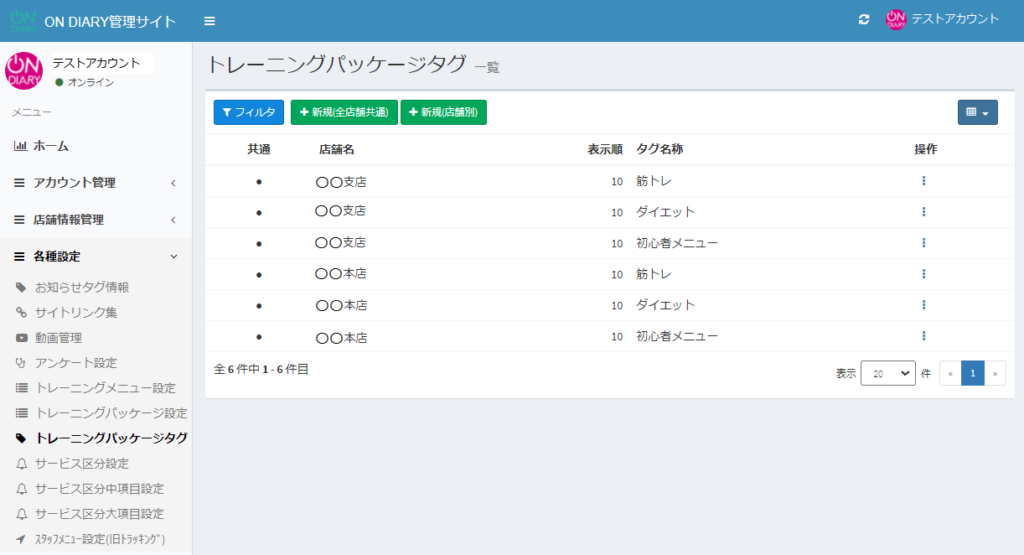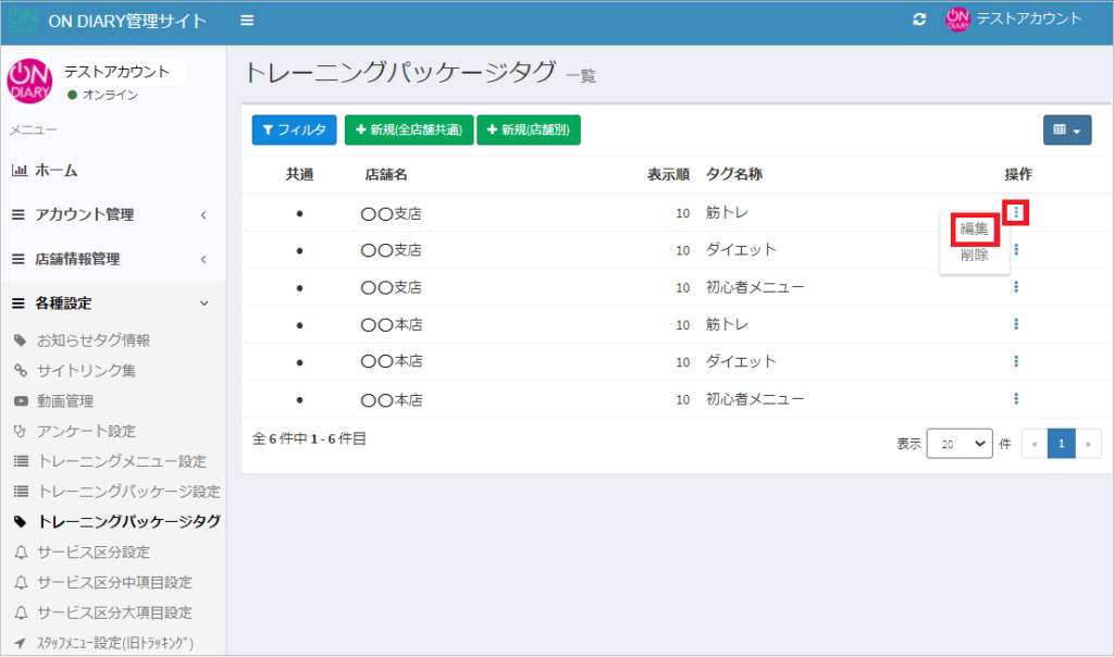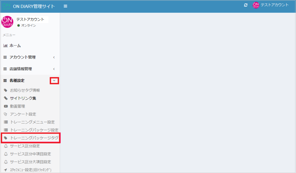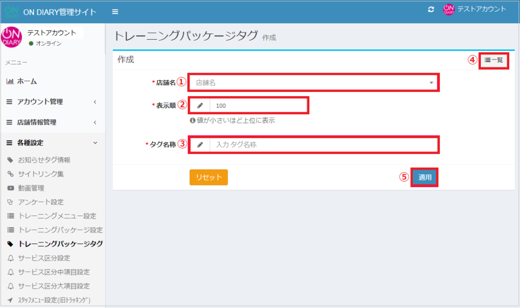ON DIARY管理サイトで、トレーニングパッケージで使用するタグを作成・編集する方法です。