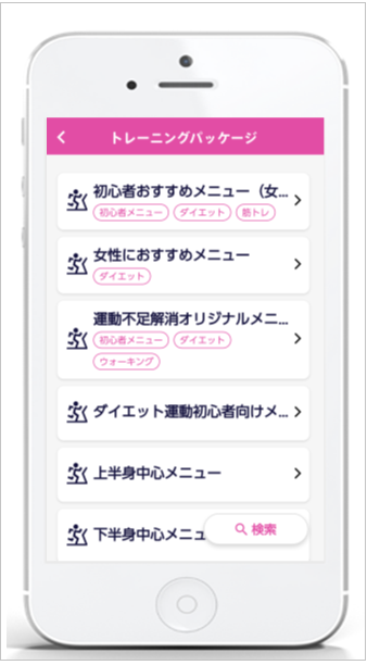 タグを設定しておくと、会員アプリのトレーニングメニュー内にある「トレーニングパッケージ」表示の際に、タグを指定して検索し、目的にあったトレーニングパッケージを表示することができます。