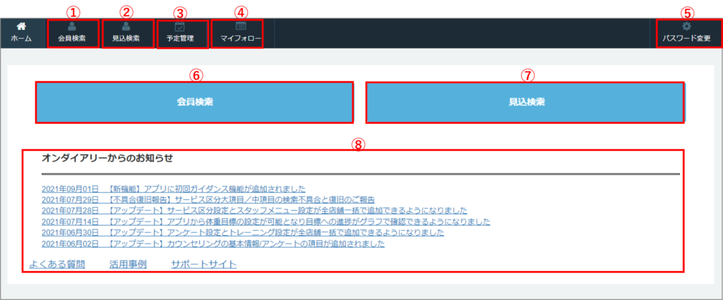 ⑧オンダイアリーからのお知らせ一覧