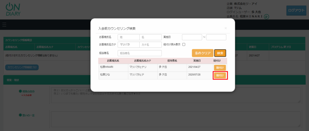 会員カルテのプログラム情報にカウンセリング情報を紐付ける