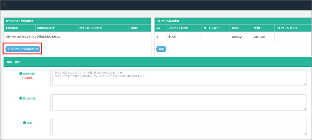 新規のプログラム作成画面の左上の【カウンセリング情報紐付け】ボタンを押す。