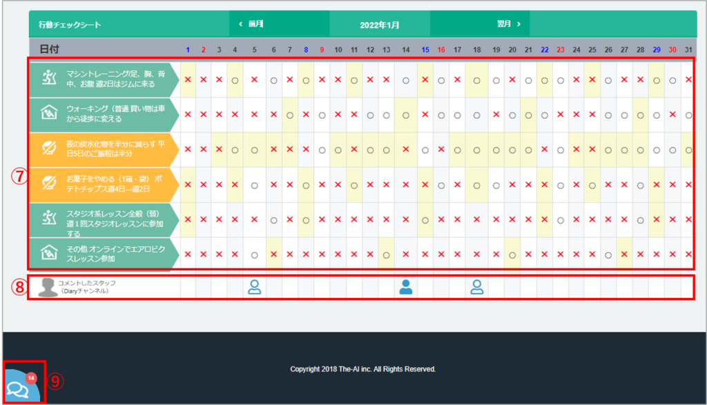 ⑧Diaryチャンネルでトレーナーがコメントした日にマークがつきます。