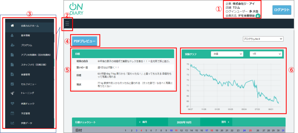 ①企業名・店舗名・ログインしているスタッフ氏名・閲覧しているカルテの会員氏名・フォローマークが表示されます。フォローマークを押すと、フォローの追加・解除ができます。