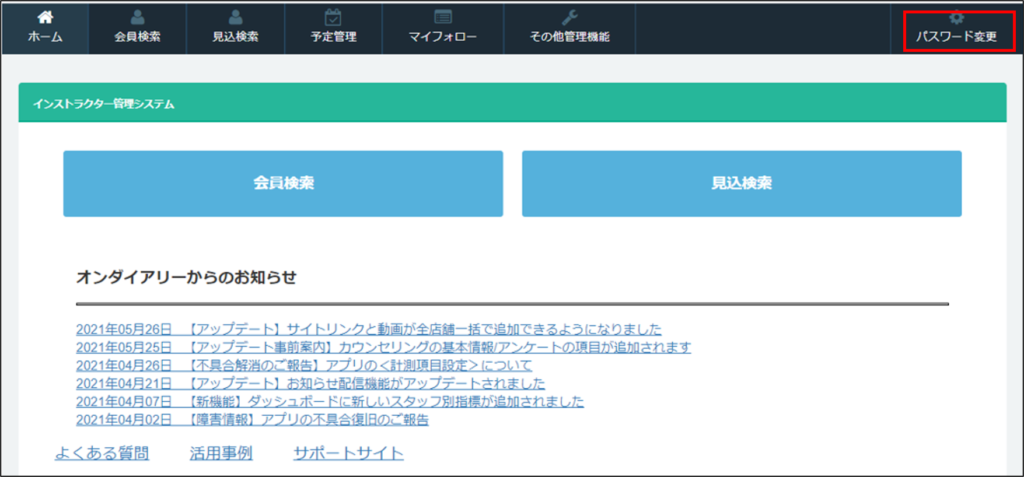 ※パスワードを忘れてスタッフサイトにログインできない場合は、ON DIARY管理サイトの編集権限のあるユーザに依頼し、変更てください。