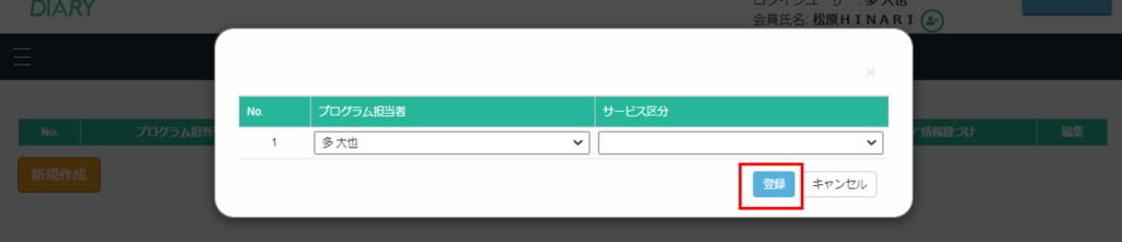 プログラム担当者・サービス区分を選び〈登録〉を押す