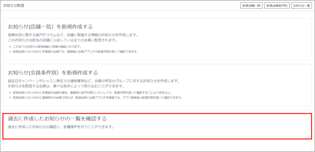 ④作成したお知らせの配信状況等を確認する場合、<過去に作成したお知らせ一覧を確認する>を選択する