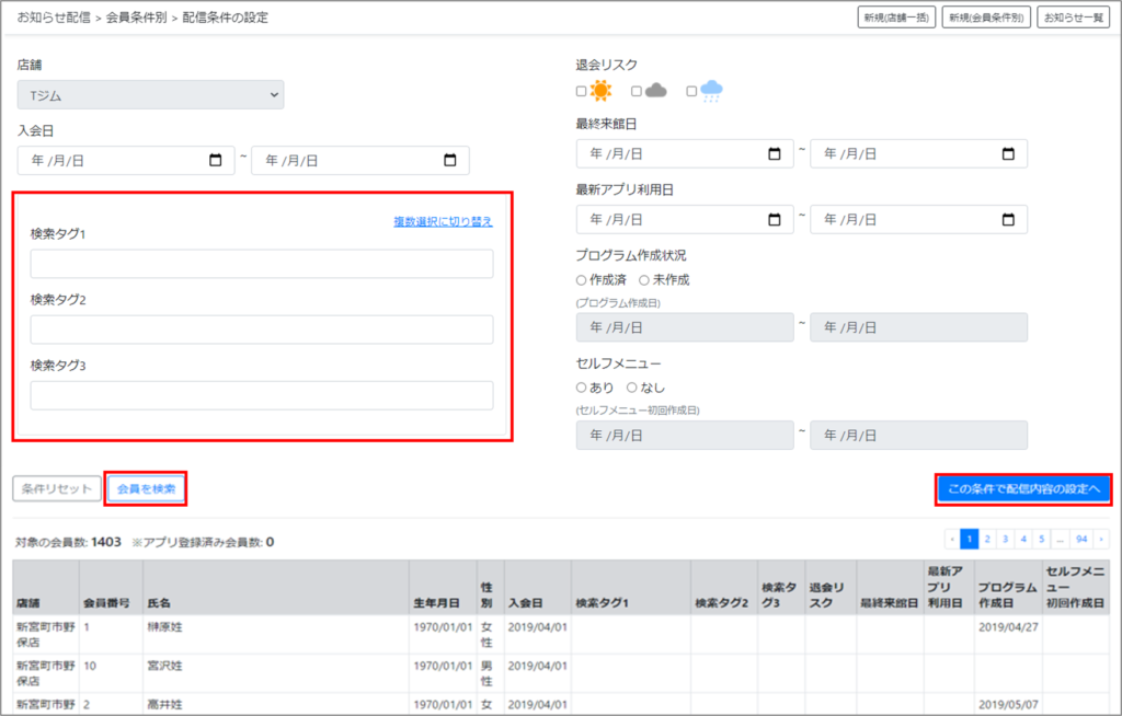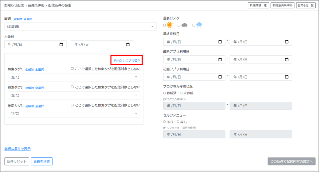 ※検索タグを選択後、「ここで選択した検索タグを配信対象としない」に ✔ をすると、選択したタグ以外の会員が対象となります。