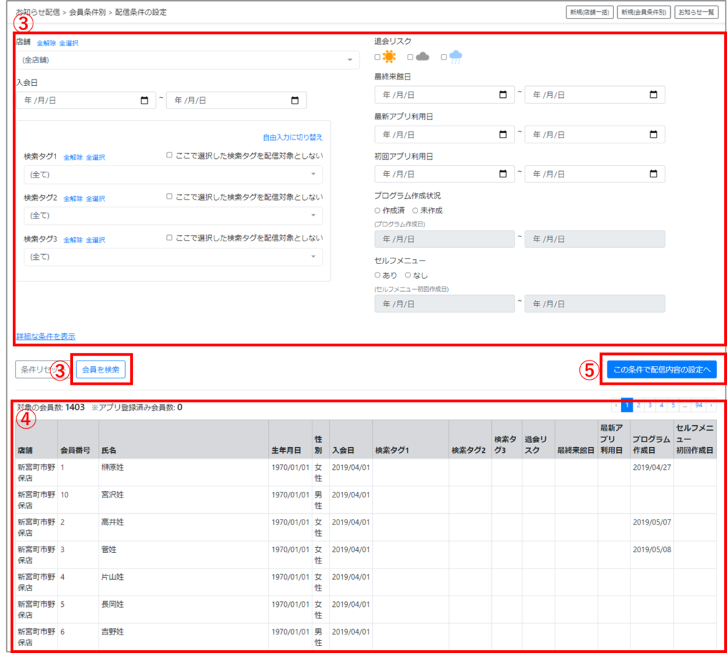 <会員を検索>を押すと指定条件の会員一覧が検索されるので、<この条件で配信内容の設定へ>を押し、配信内容設定画面が表示される(⑥へ)